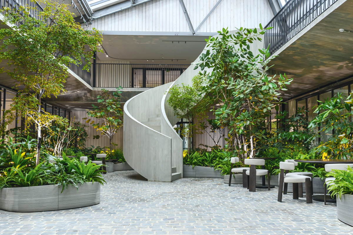 Le hall d’entrée spacieux – un atrium avec une verrière authentique – dégage une ambiance d’oasis de verdure. Outre le comptoir d’accueil design, les délimitations sinueuses dans un béton vert imprimé en 3D, agrémentées de plantes, et l’utilisation de matériaux durables comme du bois FSC font de l’effet. Le rez-de-chaussée abrite des petites et des grandes salles de réunion ainsi que le Living Lab. Dans cet espace événementiel multifonctionnel, la division Food&i de Facilicom organisera notamment des sessions de ‘show cooking’. L’escalier architectural en béton permet d’accéder à l’étage où un espace ouvert accueille les collaborateurs, ainsi qu’à deux salles de réunion et trois espaces pour