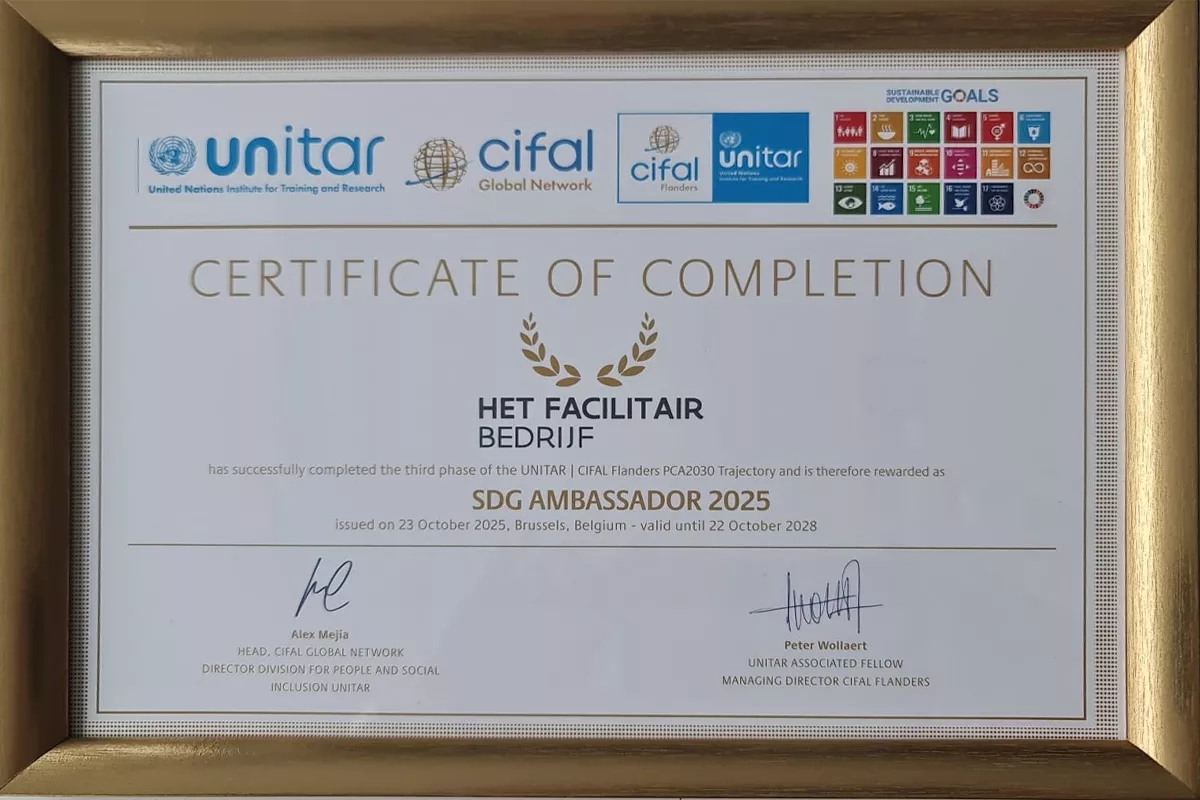 Uiteindelijk volgde op 23 oktober 2025 de erkenning als SDG Ambassadeur met uitreiking van een UNITAR-certificaat (United Nations Institute for Training and Research). Het Facilitair Bedrijf is zo de eerste Vlaamse overheidsinstelling die officieel wordt erkend als SDG Ambassadeur, een bevestiging van het langdurige engagement voor de Duurzame Ontwikkelingsdoelen (SDG’s) van de Verenigde Naties.